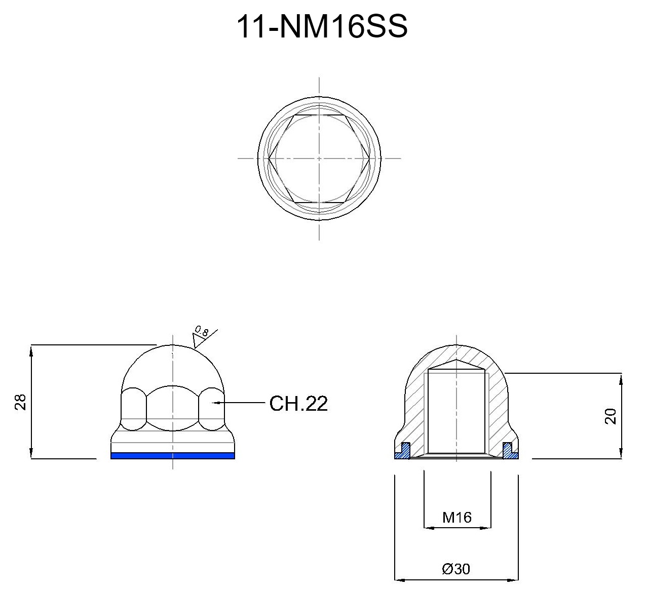 AISI 304 stainless steel high-gloss polished dome-nut, FDA blue silicone gasket. 3A accepted.